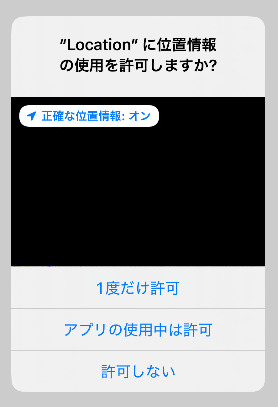 アプリ実行時にiOSの位置情報サービスに取得要求を送ると、iOSはユーザーに許可の確認を求める。