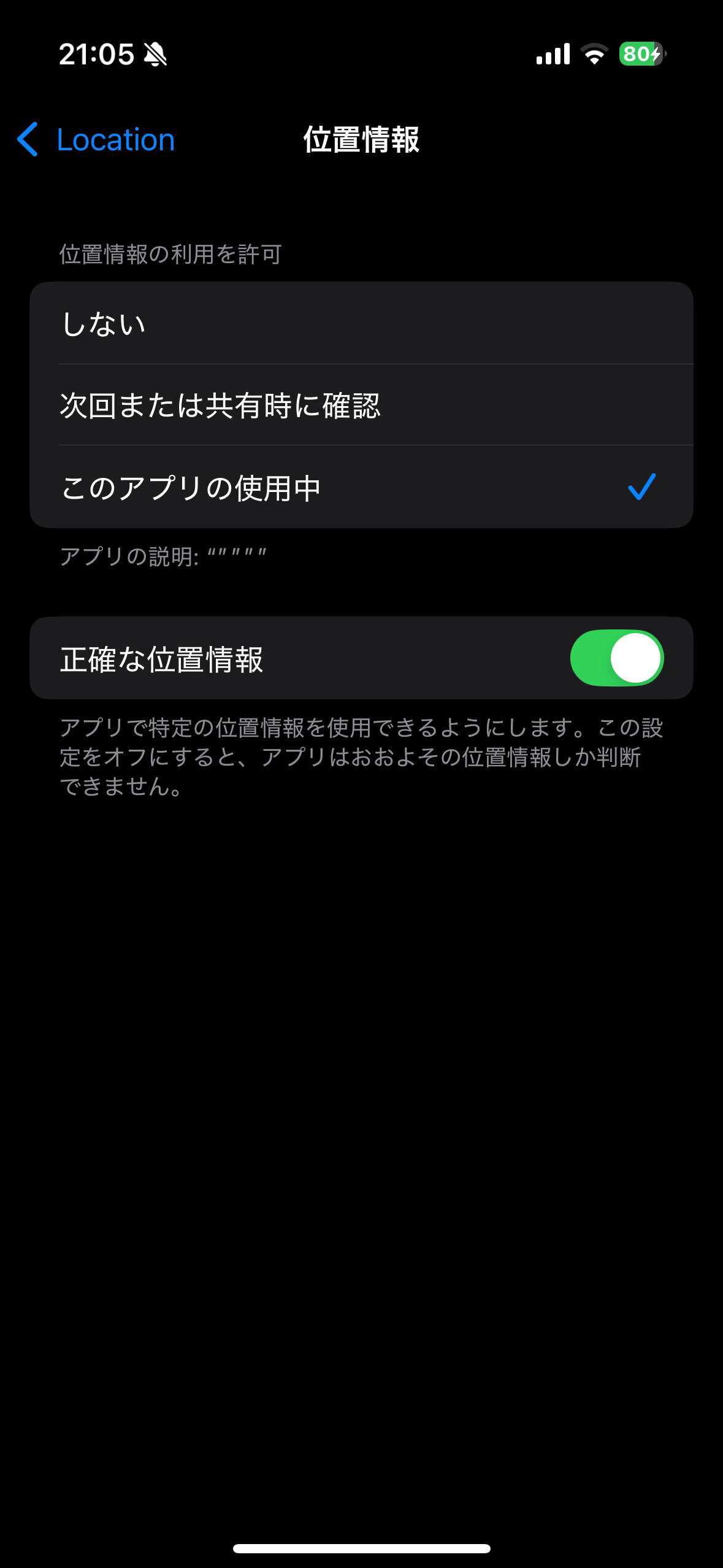 | Privacy - Location When In Use Usage Description | NSLocationWhenInUseUsageDescription | アプリがフォアグラウンドで位置情報が必要なら使う | iOS 11 以降 |